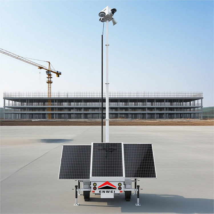Мобильный прицеп для мониторинга солнечной энергии состоит из монокристаллических кремниевых солнечных панелей, гелевых батарей, холодно оцинкованной стали, 7-метрового электрического мачты, камер наблюдения высокой четкости,4 ручной поддержки ноги, 2 износостойких шины и 1 буксирный прут.